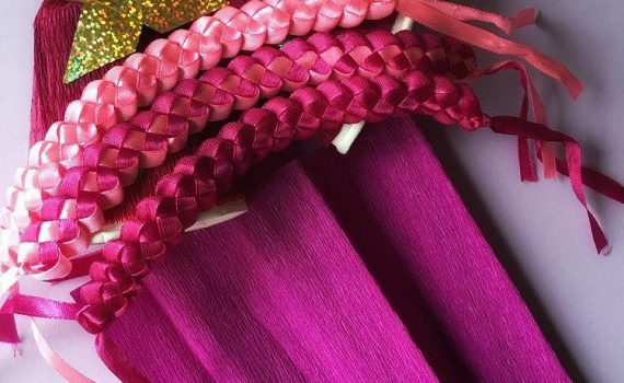 Лот № 5 “Твій яскравий оберіг” Виконали : гурток “Стильні речі” та керівник Наталія Костенко. Склад : атласні стрічки рожевого та малинового кольору. Неповторне доповнення до ВАШОГО НОВОРІЧНОГО ОБРАЗУ. Початкова ціна – 20 гривень. Наступний крок – 10 гривень